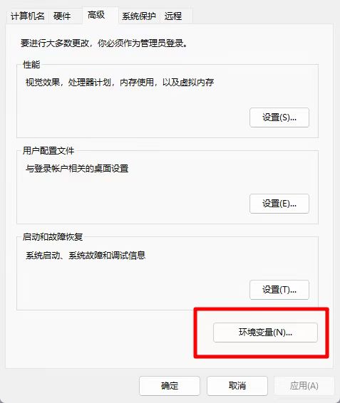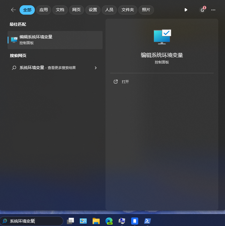- 先在开始菜单搜索“编辑系统环境变量”,再进入“环境变量”